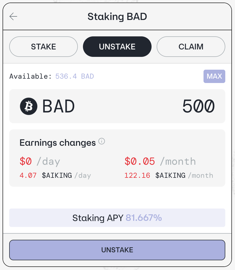 Navigate to the [unstaking](https://app.badai.io/staking/unstake) section of the terminal. Type amount you want to unstake and assess your esimated earnings after unstaking. If you're happy with it, press UNSTAKE buttom and confirm the transaction in your wallet.